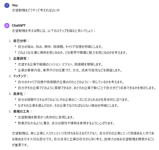 就職活動シーズン真っ盛り。気になる会社に応募するため、今日もエントリーシートを作成しなければいけません。しかし志望動機やガクチカ(学生時代に力を入れたこと)を考えるのも大変ですし、応募する企業が多ければなおさらです。そこでChatGPTに就職活動をサポートしてもらいましょう。まずはChatGPTに志望動機をどうやって考えるか聞いてみます。