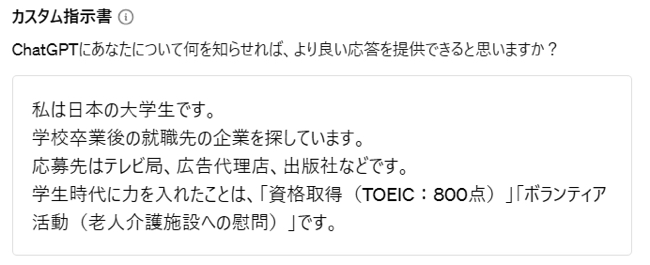 次はガクチカに合わせた自己PRを作るため、ChatGPTの機能を使います。設定の「カスタム指示書」から、自分なりのガクチカを入力しましょう。