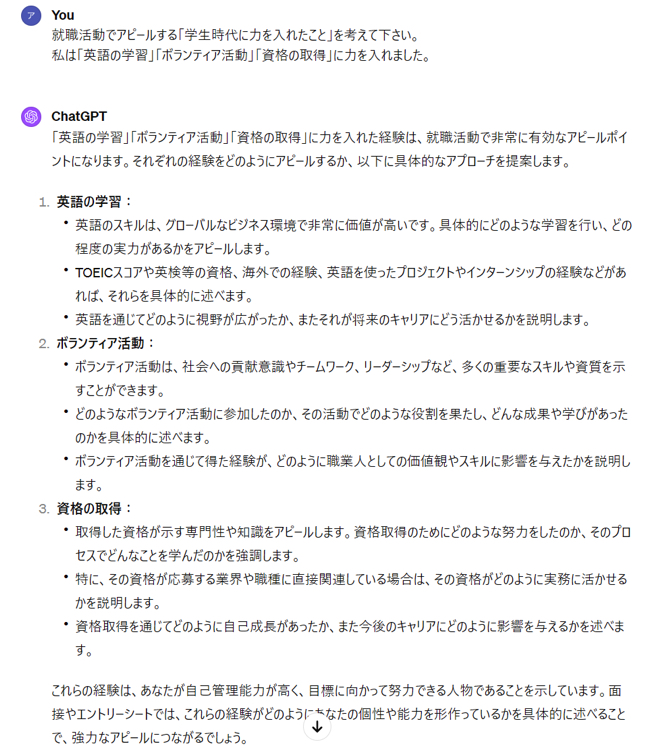 入力したガクチカの「英語の学習」「ボランティア活動」「資格取得」から、様々な答えを出してくれます。どんな点を面接官にアピールすべきか、会社でどんな風に役立つか、どう成長したのかなど、アドバイスしてくれました。