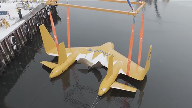 「Dragon 12」は、翼長12m、重さ28t。巨大なグライダーのような形状の潮力発電システム。
