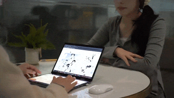 「DEEKU」は、ディスプレイを360°回転しタブレットとしても使えるノートPC。さらにデュアルディスプレイでも使える点が特徴だ。