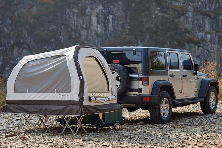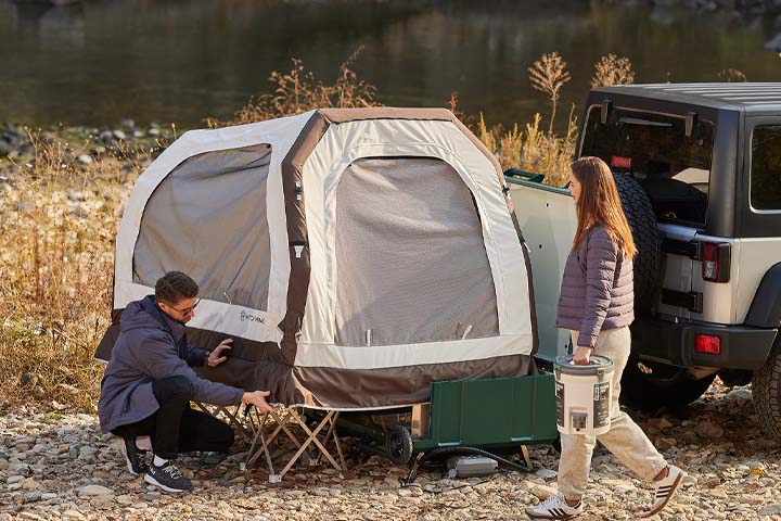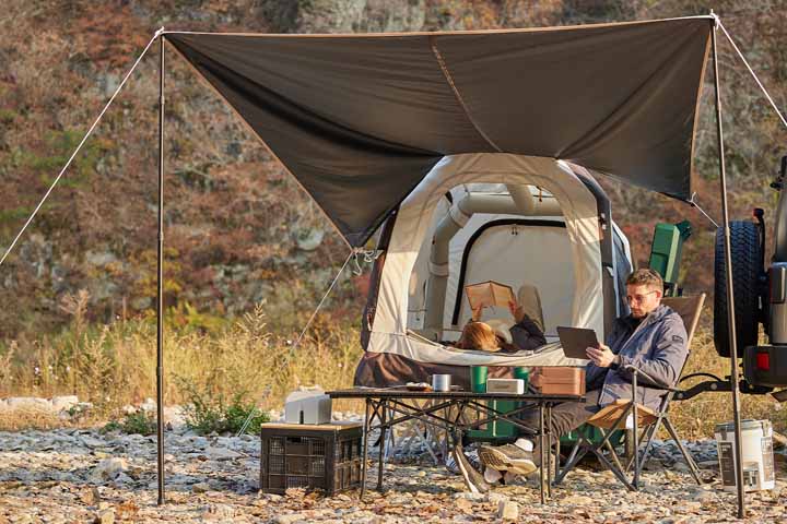 「Hitch-Home Duo+」は、車両に取り付けて運べる折りたたみ式エアテント。車両にドッキングしたままでも、切り離しても使える。テントの高さを調整できるため、車両のサイズやタイプを選ばずアウトドアを楽しめる。