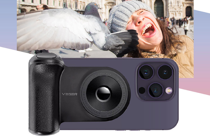 「SnapCam」は、1眼カメラのグリップを模した形状で、シャッターボタンも付いている。MagSafeで吸着したiPhoneをBluetoothで接続し、撮影リモコンとして使える。