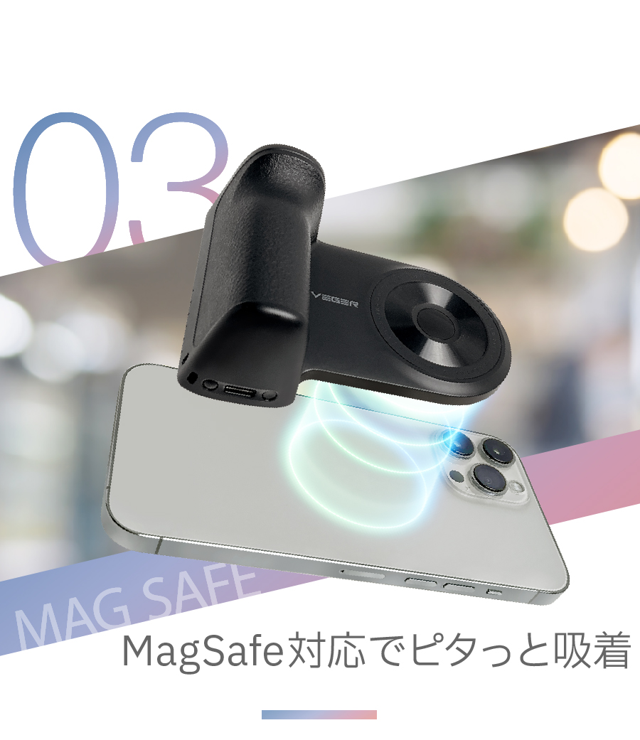 2,200mAhモバイルバッテリーを内蔵しており、スマホに充電しながら撮影できる。5Wのワイヤレス充電機能を搭載し、Qi規格対応の機種であればiPhone以外の機種でも充電可能。ただし、MagSafe非対応のスマホは、磁石のシートなどが必要になる。