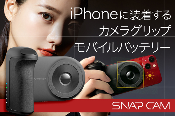 「SnapCam」は、MagSafeでiPhoneに装着するカメラ撮影用グリップ。バッテリーを内蔵し、iPhoneの充電が可能。スマホスタンドにもなる。