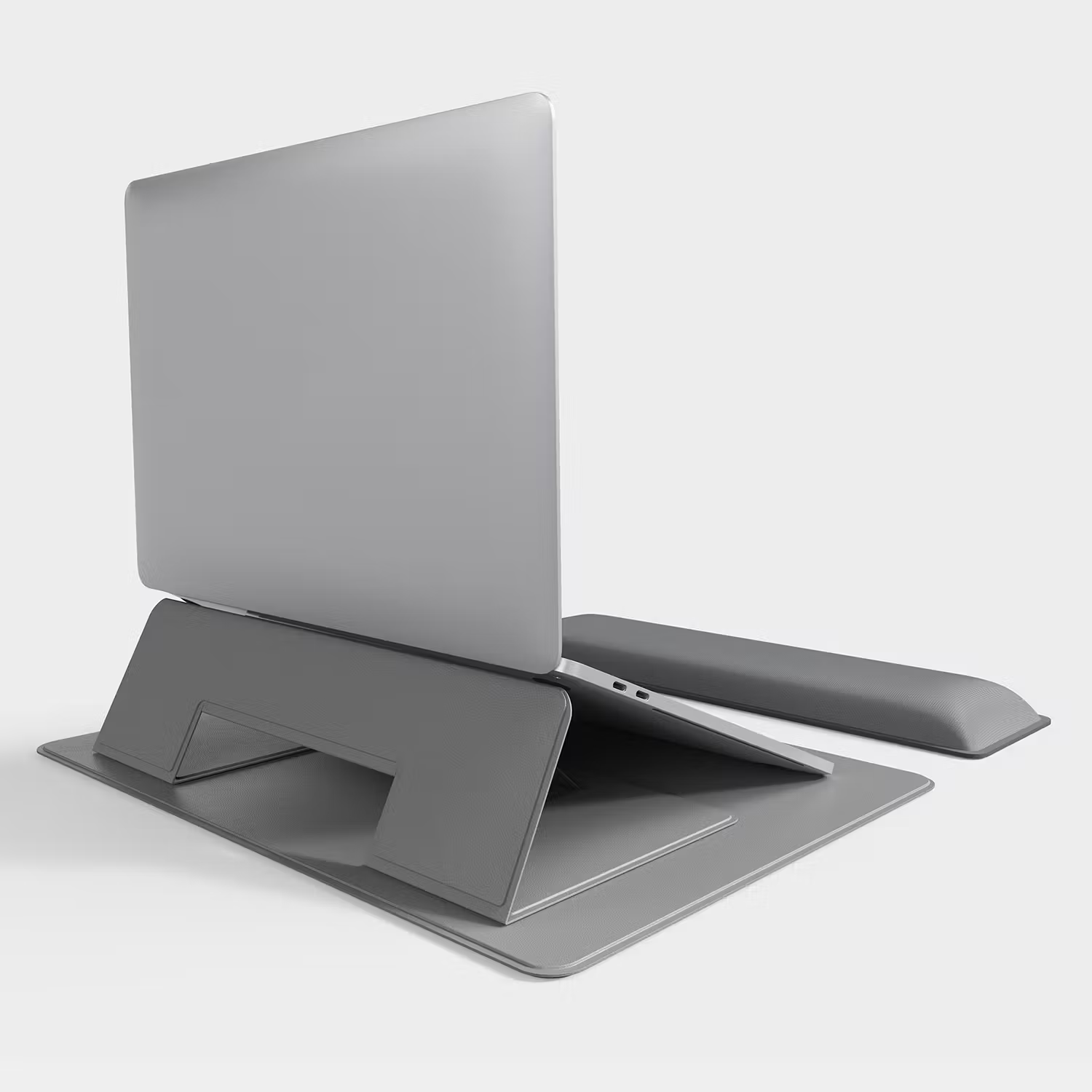 ノートパソコンスタンドの他に、スマホスタンドとクッションのパーツが付属。スマホやペンなどの小物を磁石でくっつけて整理したり、クッションをリストレストとして使用したり、作業場所や好みに合わせて自由にカスタマイズできる。
