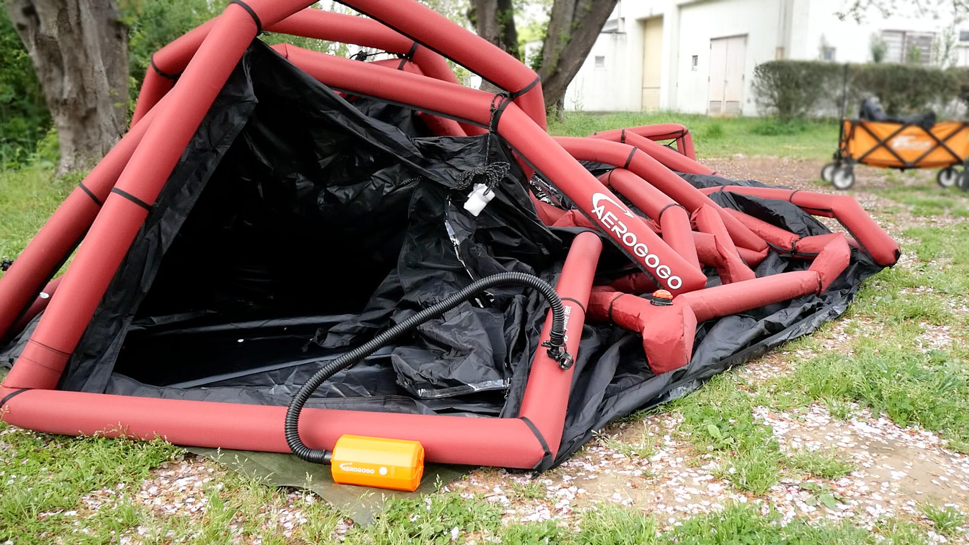 面倒なテントポールは不要。付属の電動エアーポンプで空気を送り込むだけで、6分弱でエアーフレームが膨らんでテントが立ち上がってくれます。