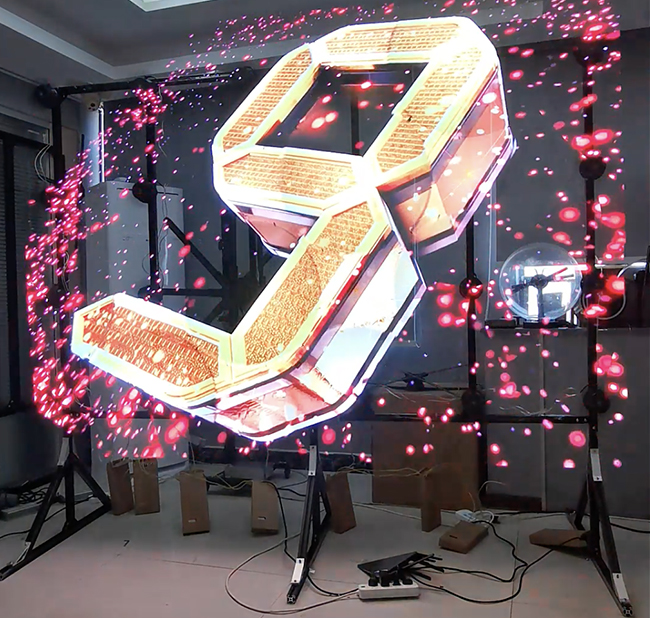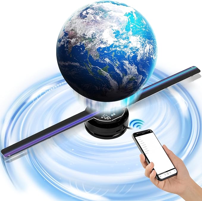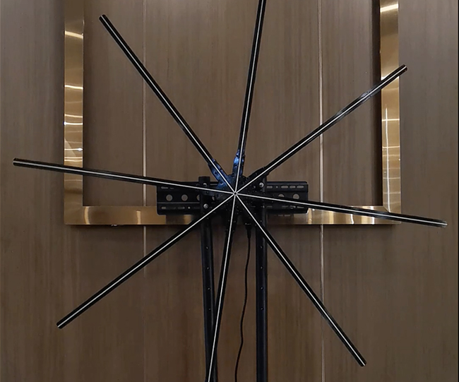 ホログラムファンとは、LEDを扇風機のように高速回転させて、3D映像をまるでその場に浮かんでいるように投影できるディスプレイのこと。