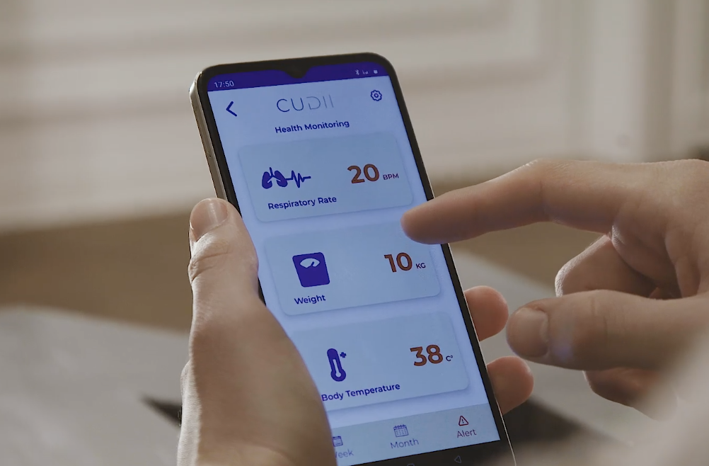 「CUDII」は、心拍数、呼吸数、体温、睡眠のパターンをモニタリングし、アプリから健康データを確認できる。