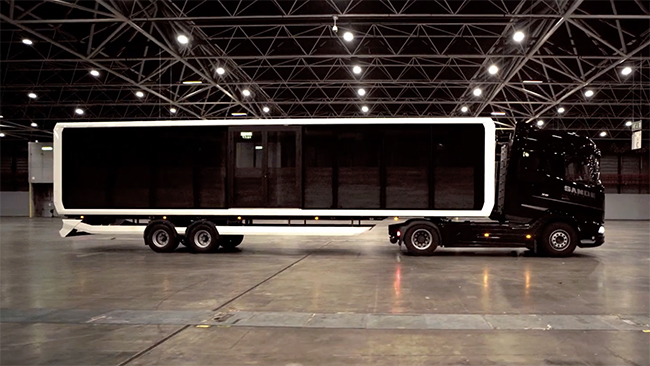「Expandable Trailer」は、全長16m・内部面積75平方メートルの大型トレーラーハウス。1人でも15分ほど設置できるシンプルな構造が特徴だ。
