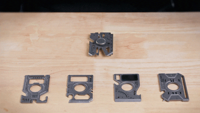 「TitanSpin」はグレード5チタン製、手のひらサイズのマルチツールだ。マグネットでくっつく5枚のカードが1セットになっていて、計80以上もの機能を搭載している。