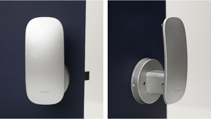 「Milda」はドアを「押す・引く」で開閉できるドアレバー。直感的に使いやすい設計で、軽い力で開閉できる。力のない子供や握力の衰えた老人、荷物を抱えた状態などでもドアの開閉が容易になるという。