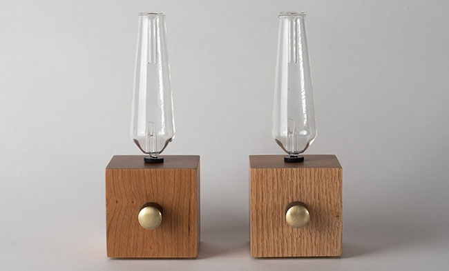 ベースの天然木はチェリーとオークの2種類から選択可能。筒は実験器具を彷彿とさせるホウケイ酸ガラス製。ツマミには青銅、裏面のカバーには真ちゅうを採用している。