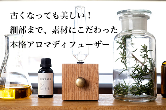 「WOODEN AROMA DIFFUSER」は、筒にアロマオイルを入れてツマミを回すと、気圧変化でオイルが霧状に変化し、香りが室内に広がるしくみだ。熱や水を使わないため、自然な香りが楽しめるという。