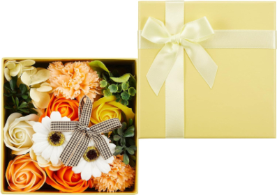 • ボックスに詰められた、花の形の入浴剤。まるで生花のように見える、美しいデザインが魅力です。