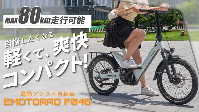 「EMOTORAD F046」は、フレームがV字型の折りたたみ電動アシスト自転車。現在、Makuakeにてクラウドファンディング中。175,000円(税込)から応援購入できる。2024年8月末までの発送を予定している。
