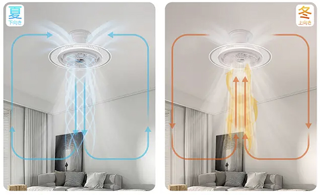 「LumaFlow」は、送風(正回転)モードと空気循環(逆回転)モードをリモコンで切り替え可能。