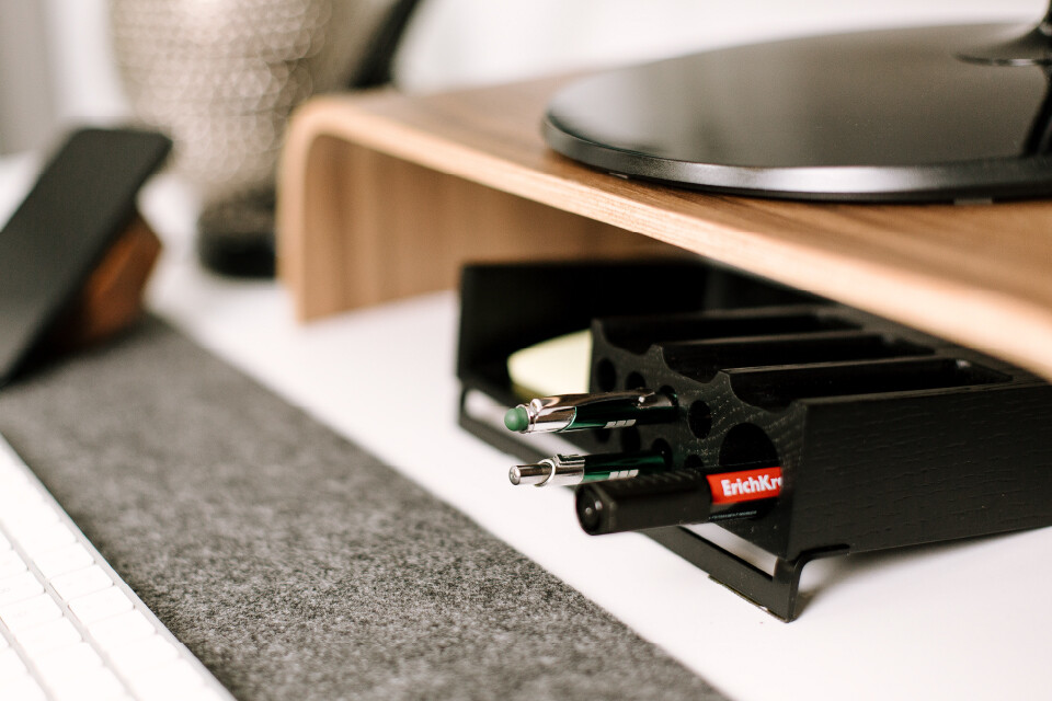 小物整理用のデスクオーガナイザーはマウスなどの小物置き・ペン刺しで構成され、デスク周りに必要な小物を整理する。寸法は約200×120×45mm。