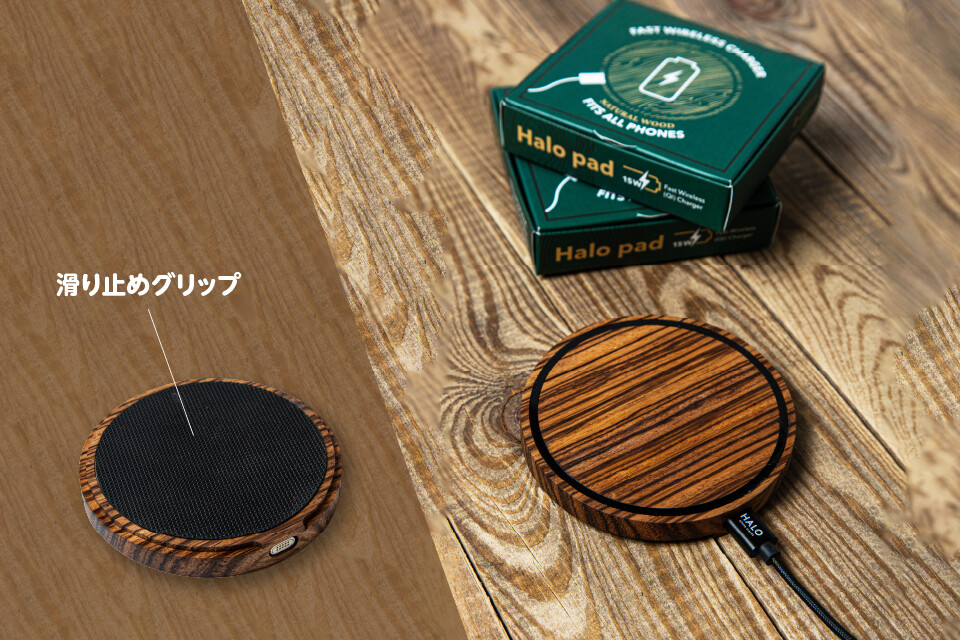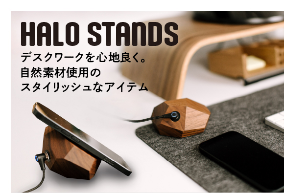 「HALO STANDS」は、天然の木材を使用したワイヤレス充電器2種(スタンド型&パッド型)・モニタースタンド・デスクオーガナイザーの計4種類で構成されるデスクアクセサリーコレクション。