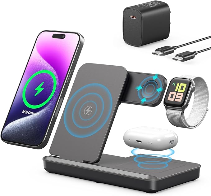 ワイヤレス充電器はスタンド型&パッド型の2種類。最大15Wで充電可能で、ワイヤレス充電対応のスマホを約2.5時間でフル充電する。