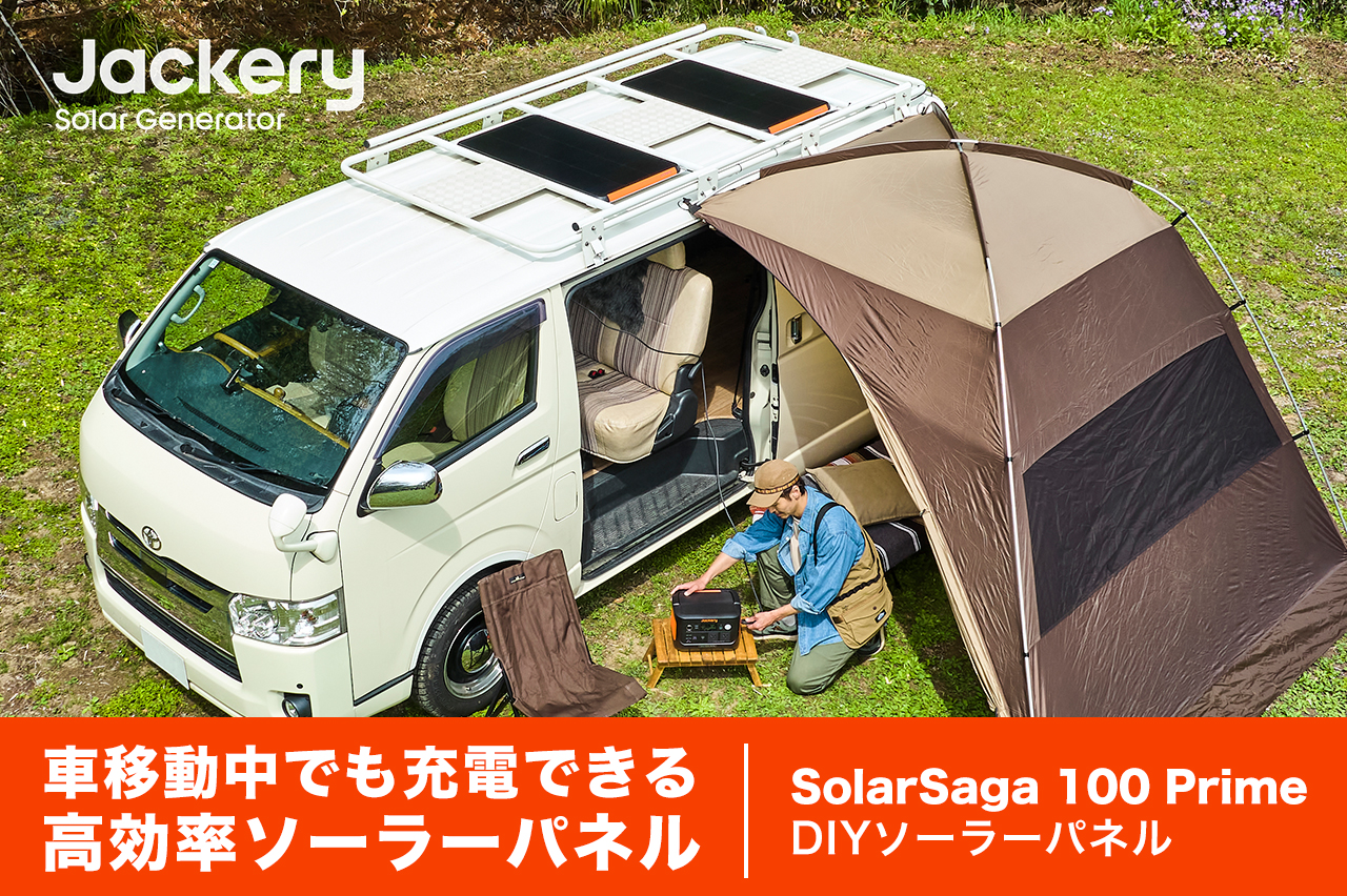 「Jackery SolarSaga 100 Prime」は、ソーラーパネル。一般車両のルーフに取り付けられ、駐車・走行中もポータブル電源に充電できる。
