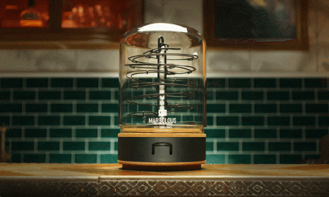 「マーブルトラック360」はガラスドームの中で、ビー玉が転がるアートオブジェ。転がる音と動きで見る人の心を鎮めてくれるという。