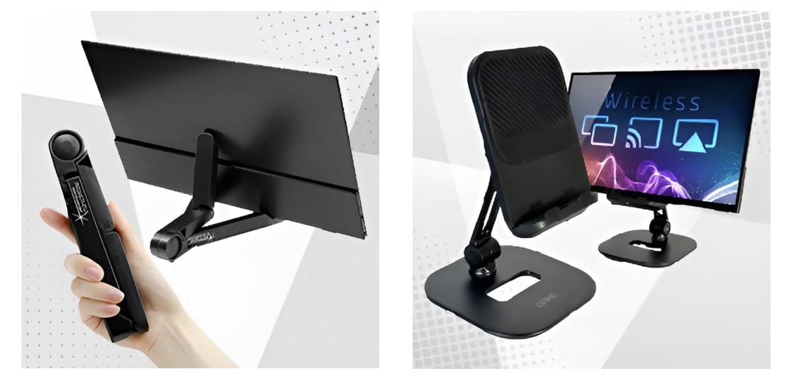 オプションでつけられる「折りたたみ専用スタンド(画像左)」や「フレキシブルモニタースタンド(画像右)」があれば使い方の幅が広がるという。