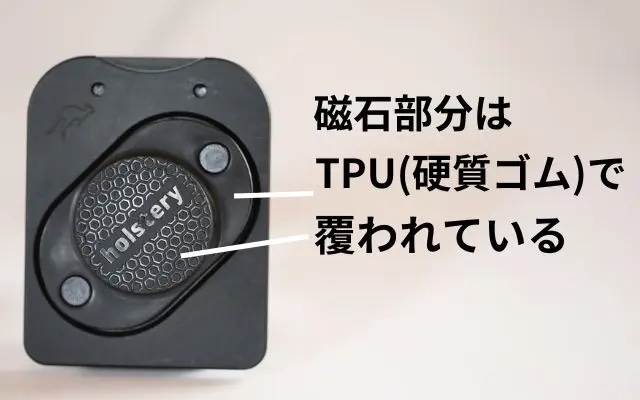フレーム素材はアルミ削り出し、ベルトと繋ぐクリップはスプリングスチール。磁石部分はTPU(硬質ゴム)で、使用時に工具を傷つけない仕様。寸法は長さ約76×60×20mm。重量約124g。