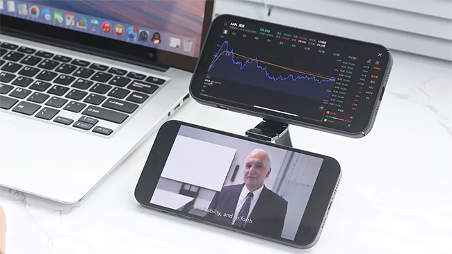 「Twins Carry」は、スマホ2台持ちユーザー向けに開発されたスマホホルダー。スマホ2台を同時に立てたり、セットにして持ち運んだりできる。