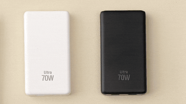 「Ultra 70Wアダプター」は、厚さ12.8mmの充電アダプター。2つのUSB Type-Cポートを搭載し、最大70Wの出力でデバイスを2台同時に高速充電できる。