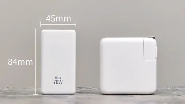 「Ultra 70Wアダプター」は、わずか12.8mm。手のひらサイズでありながら、2つのUSB Type-Cポートを搭載し、最大70Wの出力に対応する。