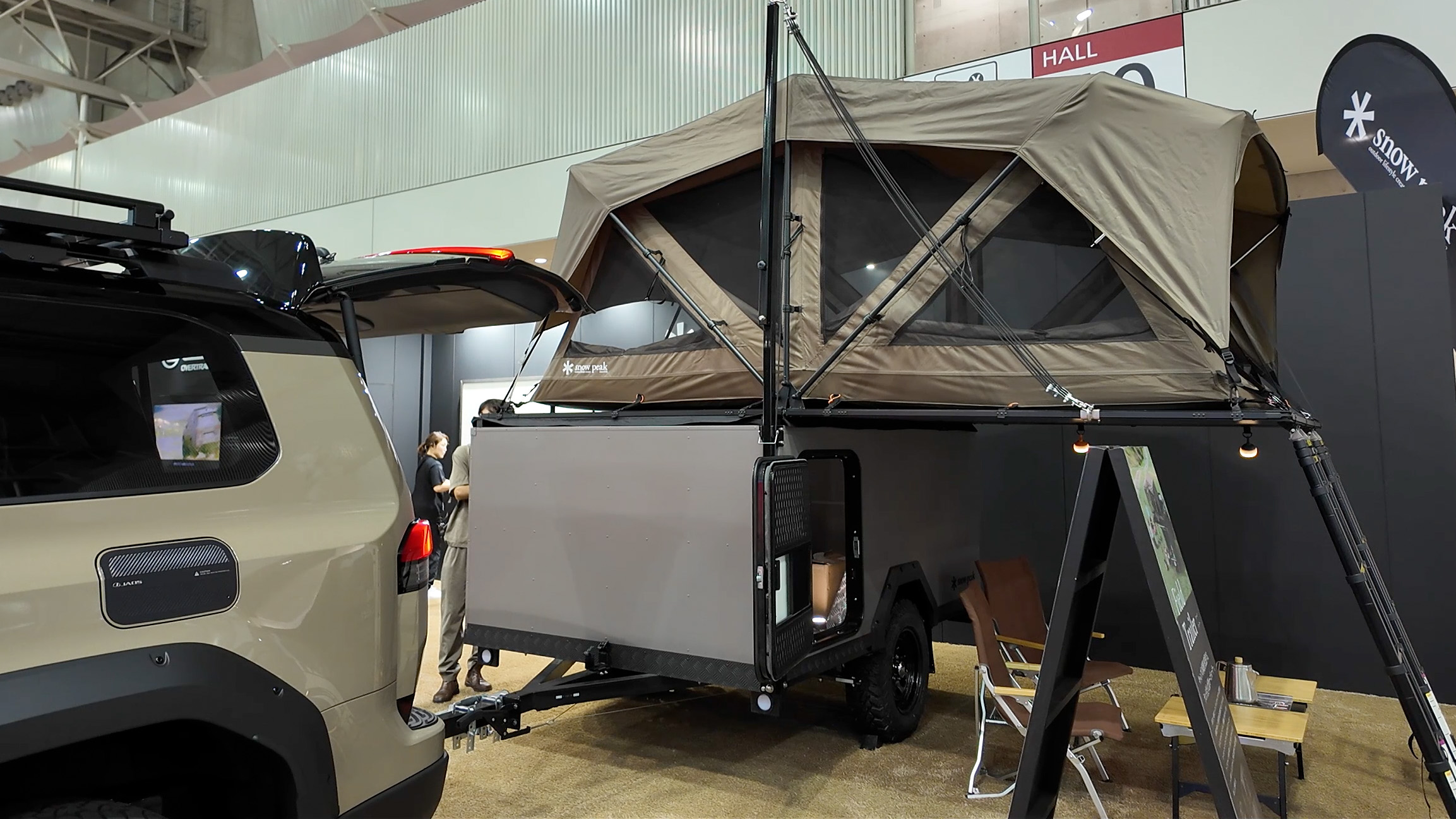 荷室とルーフテントが一体化したキャンピングトレーラー。530kgなのでけん引免許は不要。箱型の荷室にはアウトドアグッズや備蓄品などをたっぷり収納でき、上部のテントには大人4人が就寝できます。