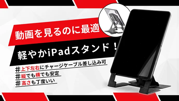 「okamiPad.lite」は、ケースからスタンドを分離して組み立てると、iPadを横向き・縦向きどちらでも置ける。