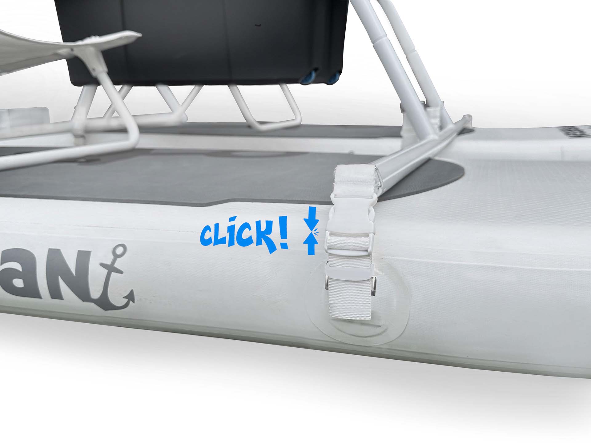 「SUPMaRaN」は組み立てやすさを重視して設計されており、数分で組み立てできるという。ボートとフレームはバックルで固定し、ビーチチェアはベルクロストラップでフレームに固定して組み立てる。