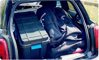 「SUPMaRaN」は付属のバッグに収納できる。バッグの大きさはフレーム用バッグが106×55×24cm、ボート用バッグは94×48×33cmが2個。78×35cmのスキューバボックスと併せても車のトランクに積載できる。