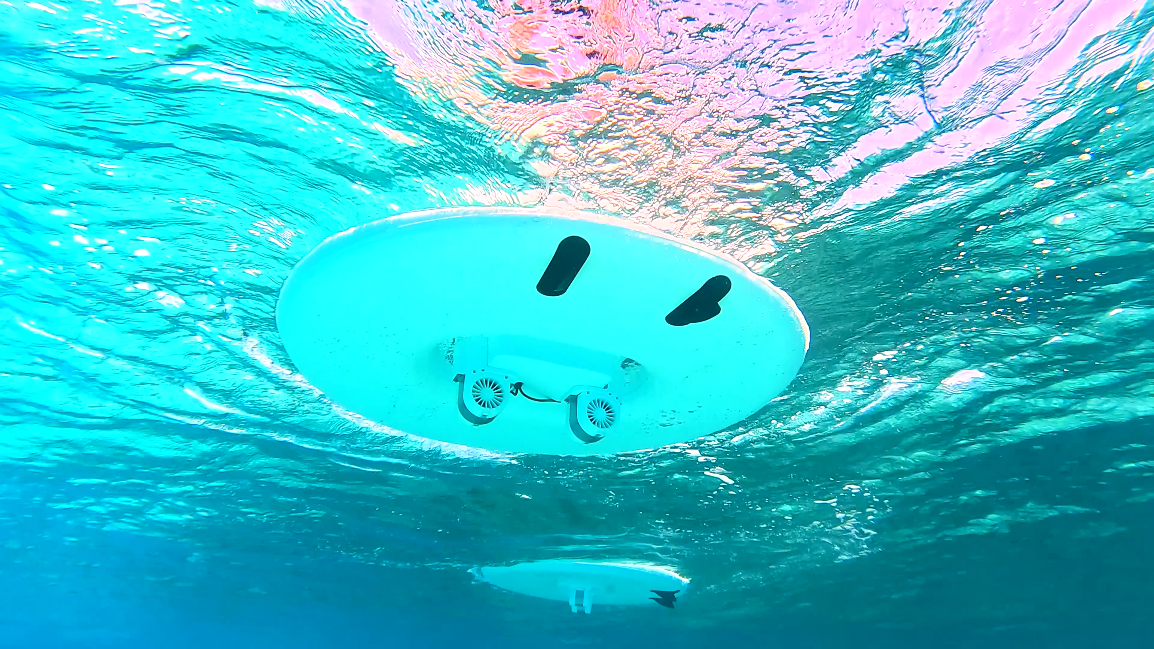 Wheeeboは直径150cmの円形ボード。電動スラスターを搭載した駆動ユニットにより、時速6km以下で水上を360度自由に進める。