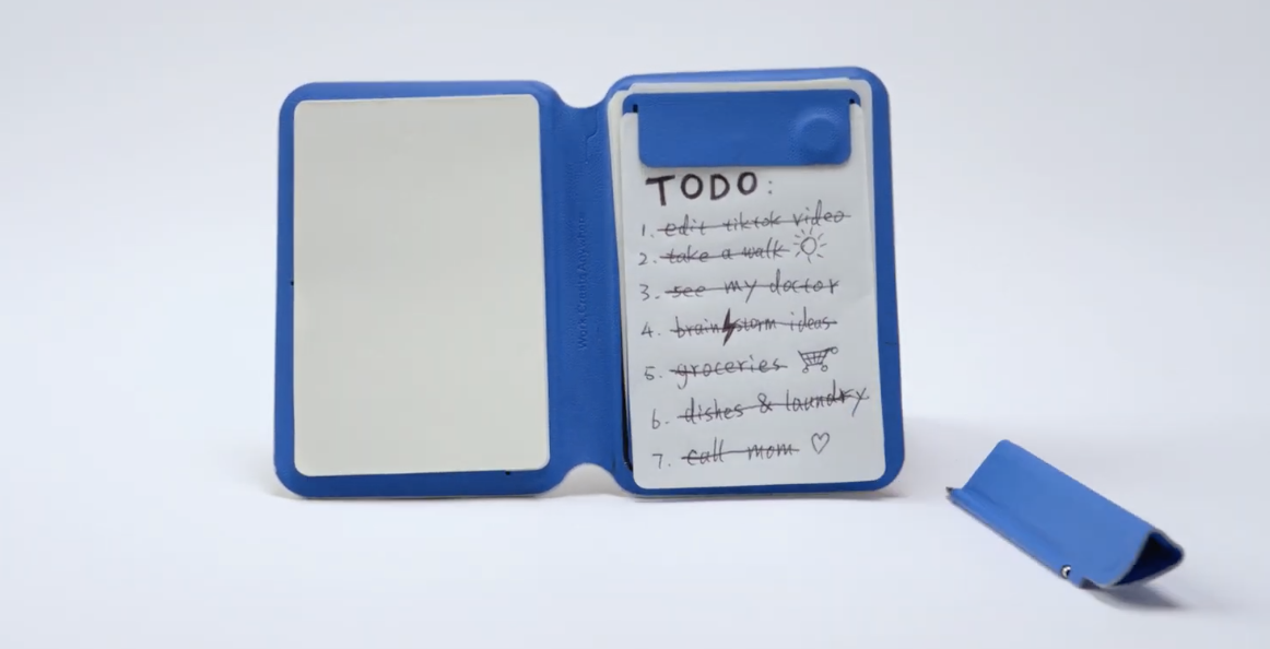 「MOFTインスピレーションスタンド&ノート」は、メモ帳と紙のように折りたためるボールペンを内蔵している。これにより、突然のひらめきや重要なタスクをすぐに記録に残せる。クリップボードも付いており、ToDoリストやスケジュールを作成して挟める。