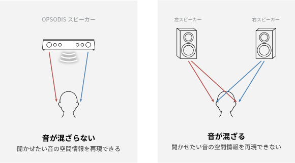 人間は音の聞こえる距離や方向を、音の大きさや左右の耳に到達する時間の違いによって判断している。そのため、「OPSODIS 1」では左右の耳に届く音をコントロールし音を混ぜないことで立体的な音を作り出している。