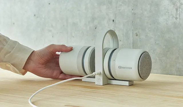 スピーカー単体のサイズは75×75×95mm。充電スタンドは130×75×130mm。2つでも重さは約750g。充電スタンドへの給電はUSB Type-C接続。フル充電で約20.5時間動作する。