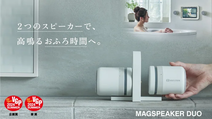 「MAGSPEAKER DUO」は、2台セットで使うワイヤレススピーカー。防水性能がありマグネット付きでお風呂やアウトドアでも使える。