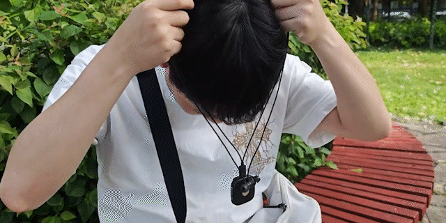 「KULARK」は、首にイヤホンケーブルを掛け、襟にクリップで装着するデザインを採用。専用のバッグも付属しているため、持ち運びしたり、使用していない時は収納ができ、本体やケーブルの紛失を防止する。