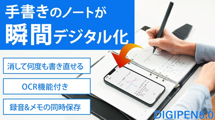 「DIGIPEN 5.0」は、スマートペンとノートのセット。専用ノートに書き込んだ内容を、ペンに搭載されたカメラが瞬時にスキャン。リアルタイムでデジタル処理し専用アプリに保存する。