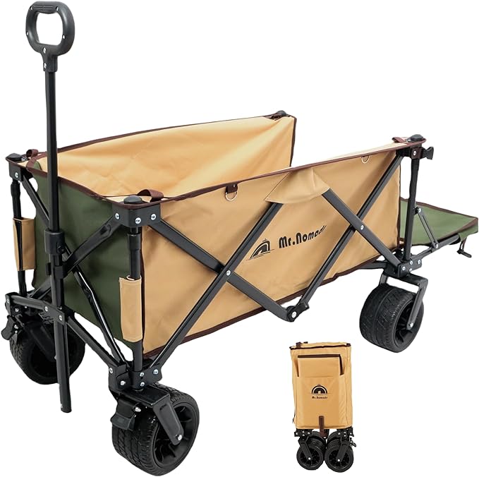 • MR. NOMADS 【ラグビー日本代表使用】 キャリーワゴン キャリーカート 4輪 こども乗せれる 折り畳み 軽量 大容量 170L コンパクト 大きいタイヤ 頑丈 耐荷重150kg 自立収納 ワンタッチ収束式 アウトドアワゴン キャンプ ワゴン カート 子供 (KW002 Olive Tan)