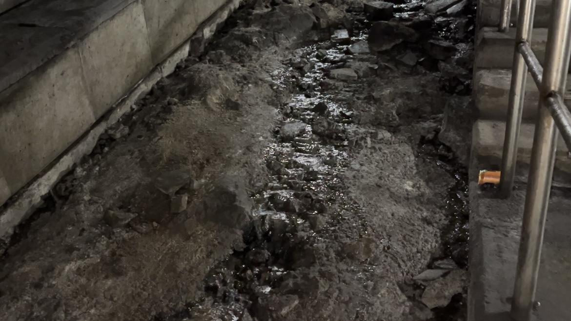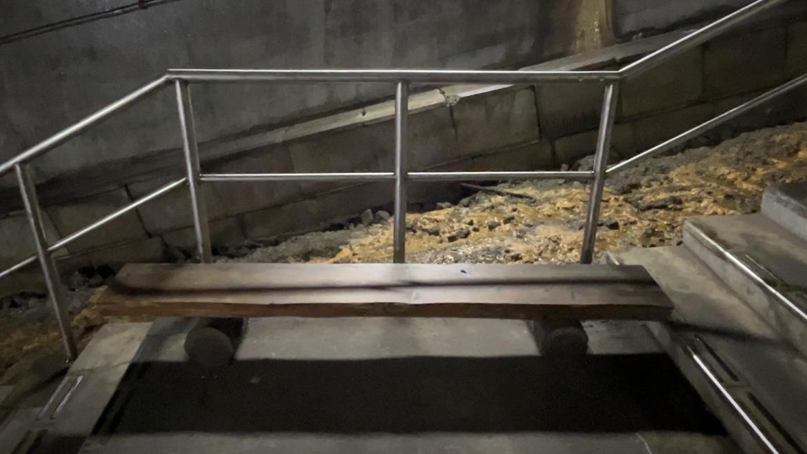 階段には段数が記され、1段目からゆっくりと斜坑を登り始める。左側のスペースには、エスカレーターを設置する予定だったとされ、現在はトンネル内から湧出する水の流路に。新清水トンネルも、湧水に悩まされた難工事だったという。