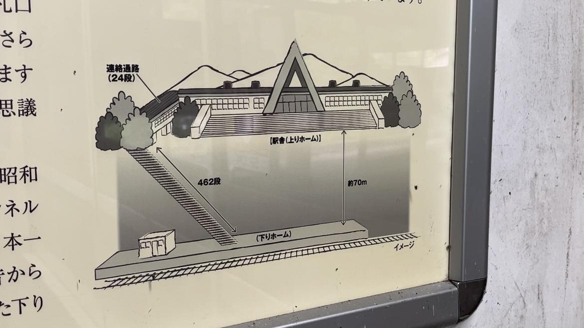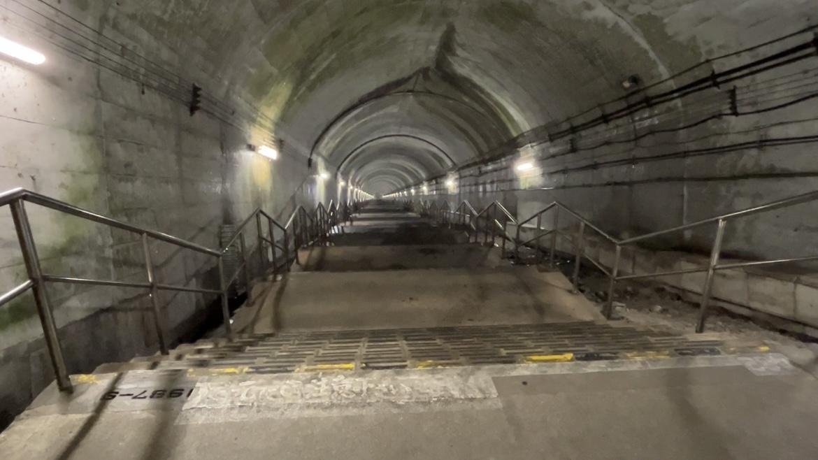 ホームから地上の駅舎までは、長さ338mの連絡通路が結ぶ。462段の階段が一直線にのび、70.7mある高低差を10分ほどかけて登る。
