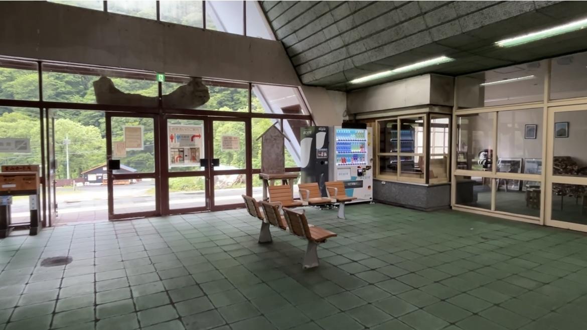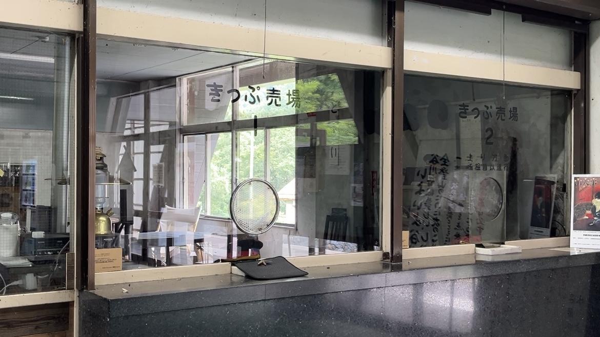 462段プラス24段の最後の1段、486段目を登り終えて、通路を右へ進むと、ようやく駅舎の中へ到着。改札口を抜けると、右手にかつての待合室と、左手には現在はカフェとして使われている、かつての駅事務室がある。