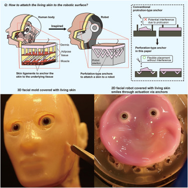 この研究では、人間の皮膚細胞から培養した人工皮膚を、独自の穴型アンカー構造によってロボットに固定させることに成功。