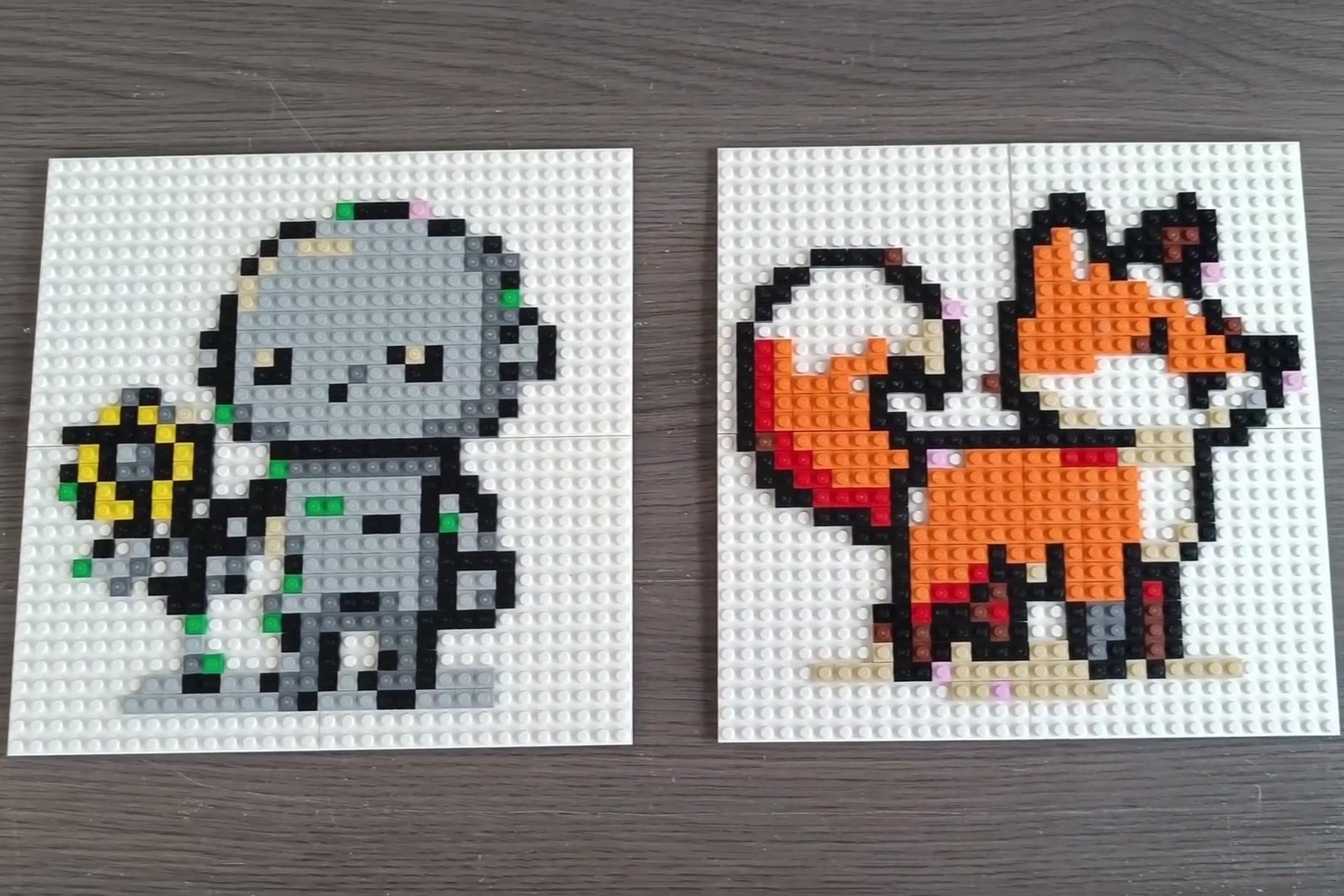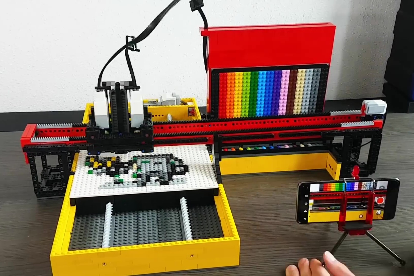 次に、レゴブロックで制作された機構で、その画像に沿った配色のブロックを選び並べていく。プリンタのようにピクセルアートができる仕組みだ。