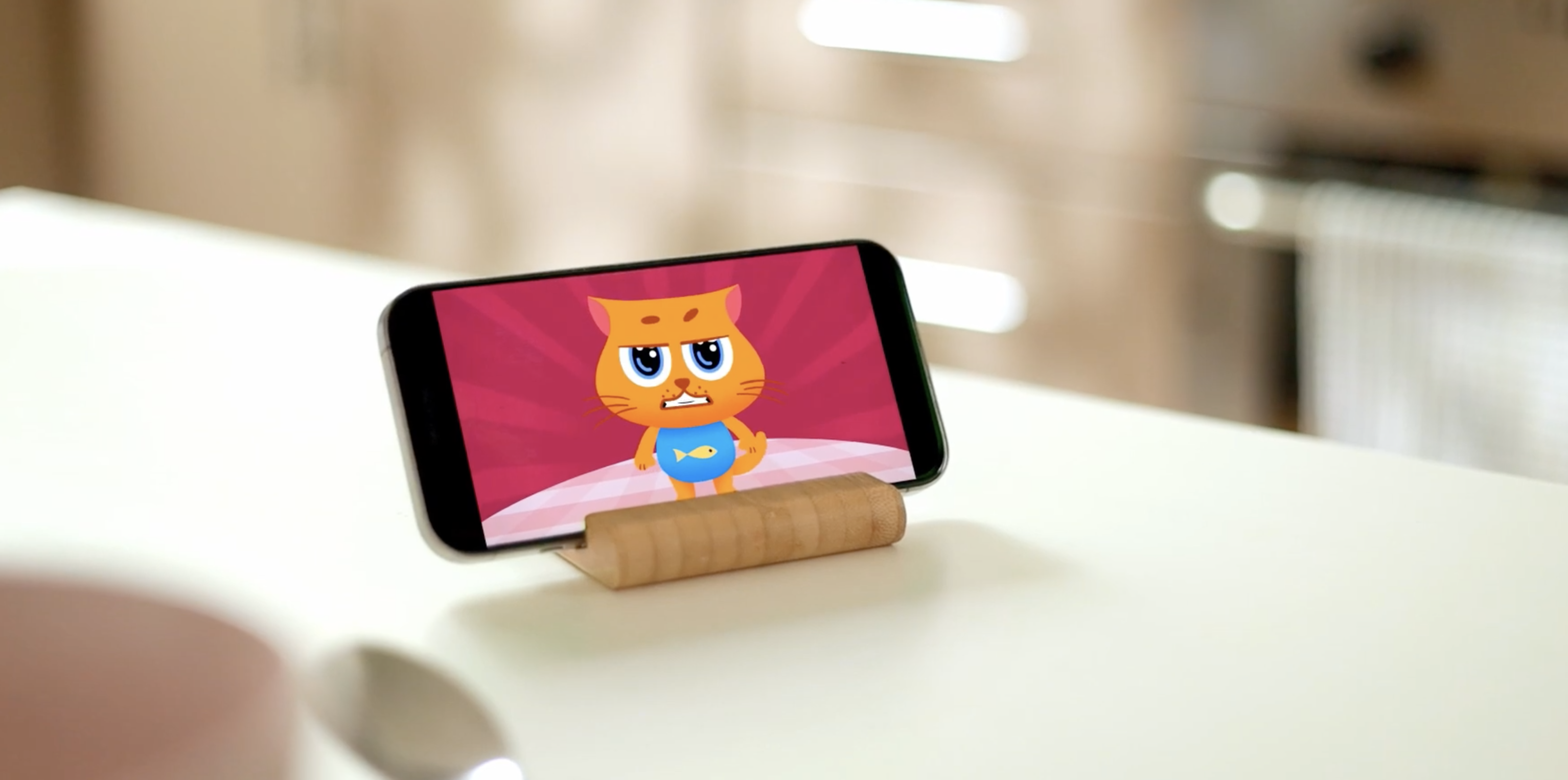 食事中は、専用のアプリでアニメーション動画を視聴できる。子供が20秒以上食事を中断すると、Bluetoothを通じてアプリに通知が送られ、再生中の動画が自動的に一時停止する。そして、TUMMYが食事を再開するように子供に優しく促してくれる。子供が食事を再開すると、再度動画も再生される。これによって、子供が食べ続けることをサポートする。