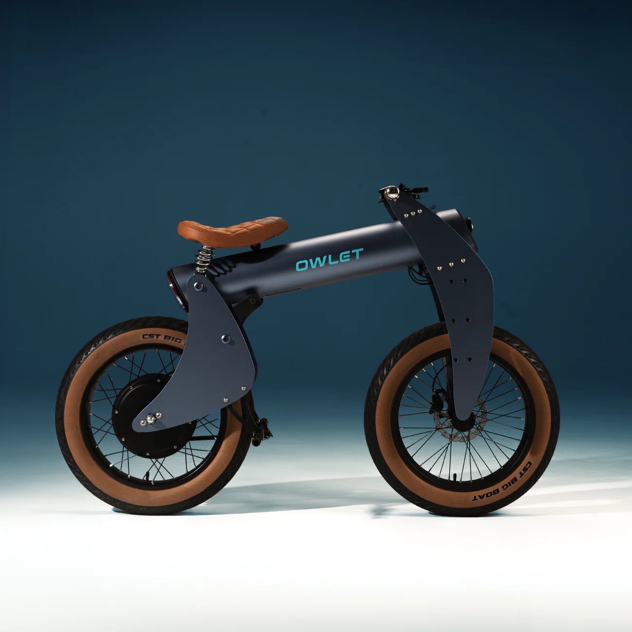 太い円筒形のフレームから覗くのは、フクロウの目のような丸いヘッドライト。モダンでありながら、ブラウンレザーのサドルとハンドルがレトロ感も演出している。
